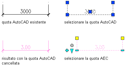 La nuova quota AEC viene inserita in base alle specifiche dei passi 6 e 7. Se le quote AutoCAD originali non sono state cancellate, rimangono nelle posizioni originali. |