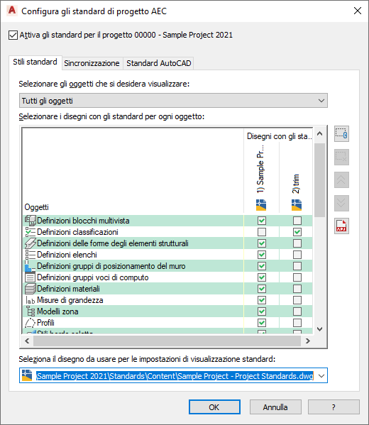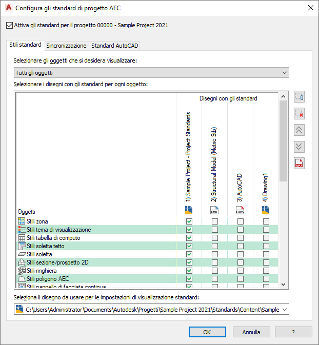 Successivamente, è necessario specificare il disegno con standard per le impostazioni di visualizzazione del progetto. Per queste impostazioni è possibile specificare un solo disegno con standard, che può corrispondere a quello già specificato per gli stili standard.
