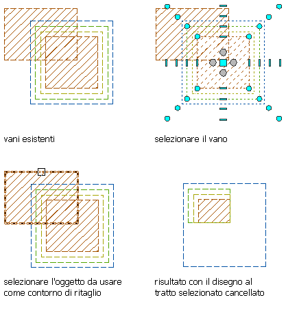 Se un contorno vano manuale non è attivato (ovvero non sono visualizzati i grip corrispondenti) nel primo vano, il contorno non viene incluso nell'operazione di intersezione. Di conseguenza il contorno esistente nel primo vano resta invariato e il contorno corrispondente nel secondo vano viene eliminato. Ciò può dare origine ad irregolarità nei contorni di vano. Per evitare tale eventualità verificare che nel primo vano siano attivati tutti i contorni necessari.
