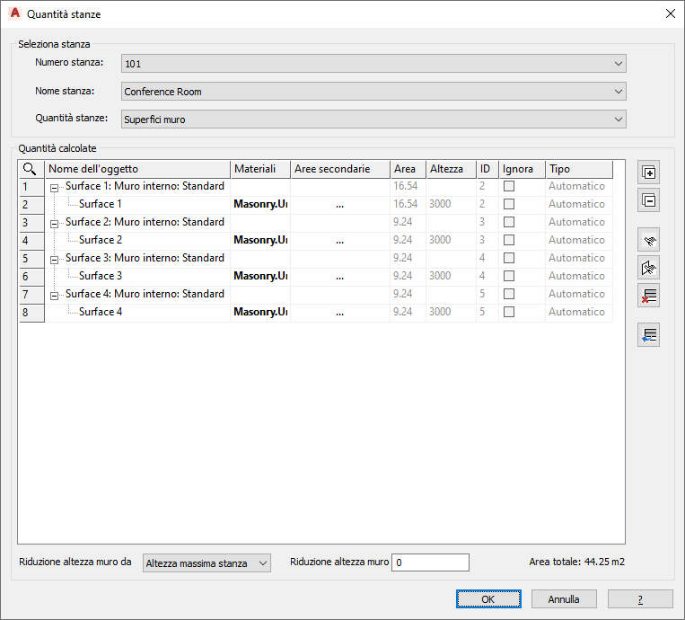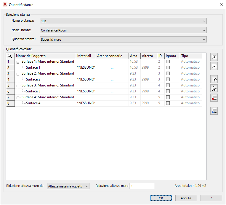 Vengono elencate tutte le superfici muro che appartengono alla stanza selezionata. Per ogni oggetto e faccia viene visualizzata l'altezza.