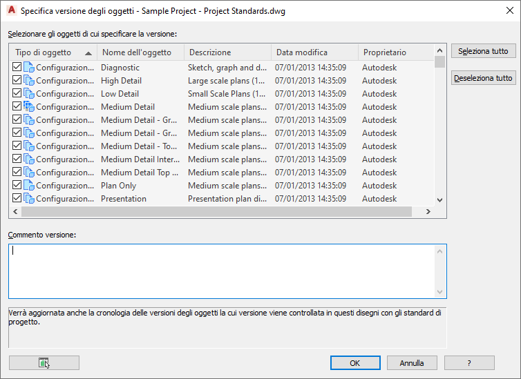 Se si salvano le modifiche ma non si specifica una versione, nelle sincronizzazioni eseguite nel frattempo le impostazioni di visualizzazione modificate non risulteranno tali, poiché il confronto viene eseguito con il GUID della versione e non con le effettive proprietà degli oggetti. Di conseguenza le impostazioni di visualizzazione che sono state modificate ma per le quali non è stata specificata una versione negli standard di progetto non verranno aggiornate nei disegni di progetto. Per sincronizzare le modifiche con il progetto, occorre dapprima specificare una versione per le impostazioni di visualizzazione modificate.