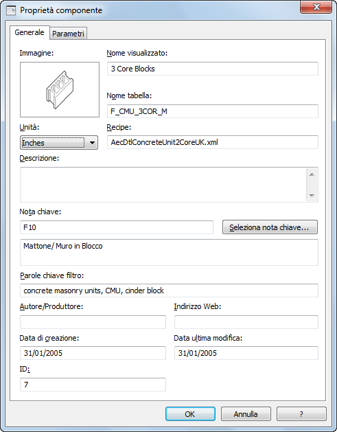 Per modificare le proprietà di singoli componenti di un database di componenti di dettaglio, attenersi alla procedura indicata di seguito. Le proprietà riportate nelle schede Generale e Parametri della finestra di dialogo Proprietà componente costituiscono la base per uno o più recipe utilizzati per disegnare il componente nelle varie viste. In ciascun recipe viene specificato il tipo di maschera di inserimento, o routine di disegno, per il posizionamento del componente in una determinata vista. Il recipe può anche contenere informazioni relative al layer e al modello di tratteggio. La stessa procedura può essere utilizzata anche per personalizzare i componenti presenti nei database con unità di misura metriche o inglesi forniti con il software o in quelli creati dall'utente.