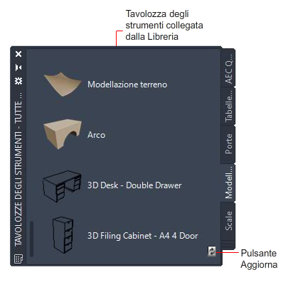 Quando una tavolozza viene collegata all'insieme delle tavolozze da un catalogo della Libreria, nella parte inferiore della tavolozza viene visualizzato il pulsante Aggiorna.