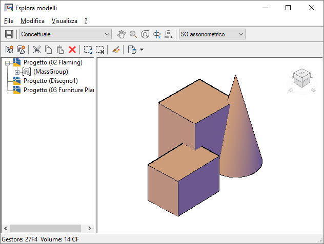 Esplora modelli è una finestra in cui è possibile creare, visualizzare e modificare elementi massa e gruppi di masse. In Esplora modelli il visualizzatore oggetti consente di visualizzare l'anteprima degli elementi massa e dei gruppi di masse utilizzati.