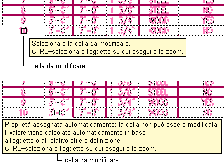 Visualizzazione delle descrizioni comandi per la modifica degli oggetti nella cella della tabella