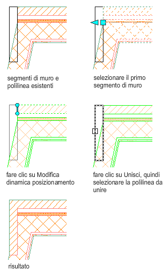 Per modificare un'intersezione muro mediante l'unione di un profilo con un componente, attenersi alla procedura indicata di seguito. Per profilo si intende un'area delimitata da una polilinea, sovrapposta ad un componente specifico o coincidente con tale componente.
