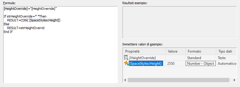 Ai valori di esempio viene assegnato un formato e tali valori vengono inseriti nella formula al posto dei nomi definizione di proprietà corrispondenti, racchiusi tra parentesi. Viene valutata l'intera formula di esempio e il risultato viene visualizzato nel riquadro Risultati esempio.