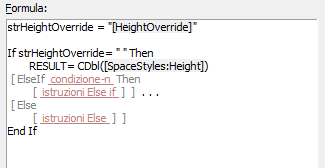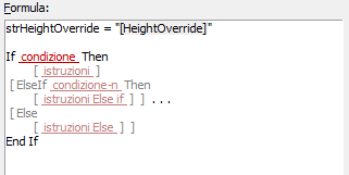 Dopo l'aggiunta del codice VBScript alla formula è possibile aggiungere testo rosso o grigio per semplificare la creazione della formula. Il rosso indica campi in cui occorre aggiungere codice supplementare. Per rimuovere un campo rosso, selezionarlo e immettere del testo, una definizione di proprietà o altro codice VBScript.