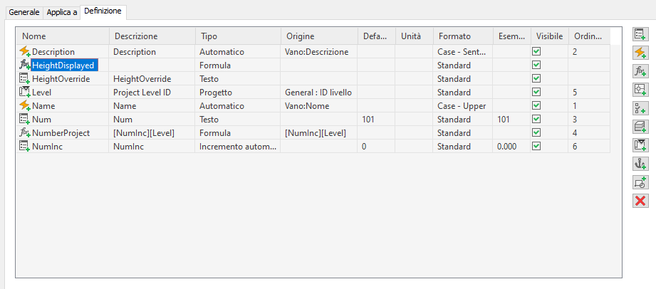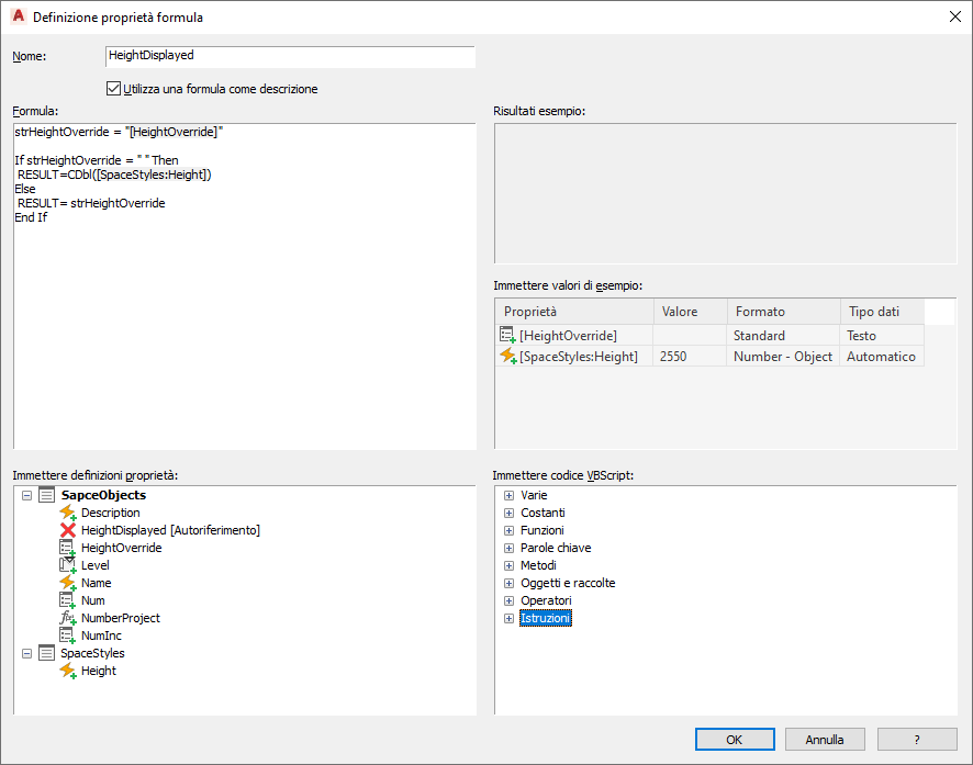 Quando una definizione di proprietà viene inserita, il valore di esempio viene preso da un oggetto nel disegno corrente che utilizza la definizione gruppo voci di computo della formula o da un oggetto di default.