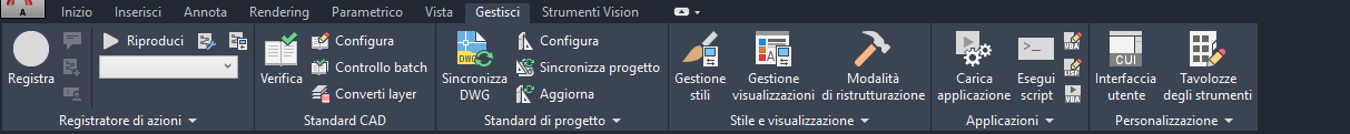 Nella scheda Gestisci sono disponibili funzionalità per utenti avanzati e amministratori CAD.