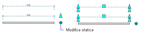 Se si seleziona un grip attivatore viene eseguita immediatamente un'azione su un oggetto, al contrario di quanto avviene con un normale grip di trascinamento, che è necessario trascinare per modificare la proprietà di una quota. I grip attivatori consentono di impostare proprietà distinte di un oggetto, come ad esempio la direzione di oscillazione di una porta o la giustificazione di un muro. È anche possibile usare questi grip per cambiare la modalità di modifica con grip di un oggetto. Ad esempio, selezionando il grip Modifica griglia in una facciata continua, si attiva una sessione di modifica dinamica per la griglia della facciata continua. Se si seleziona il grip Modifica dinamica in una quota AEC, vengono attivati ulteriori grip per le singole sequenze di quote, stringhe di testo e linee di estensione. Un grip attivatore viene in genere visualizzato con un cerchio o una freccia.