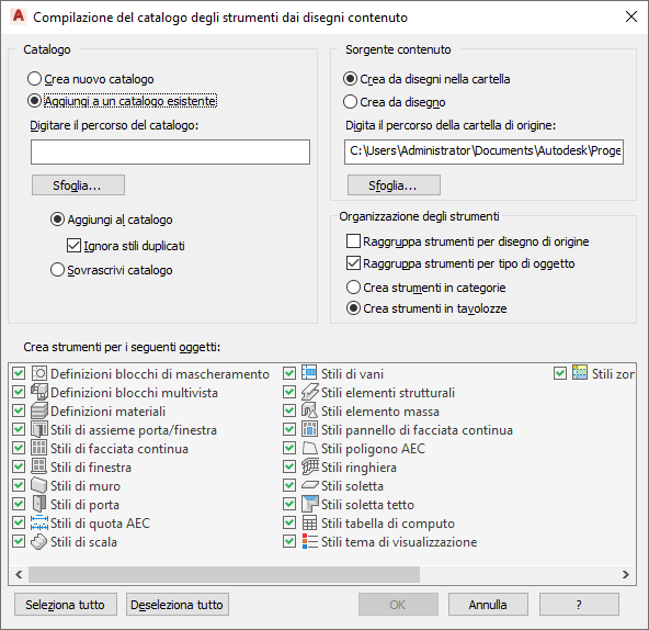 Questa opzione è consigliata quando si desiderano riunire nel catalogo gli stili di più disegni. Gli strumenti risultanti verranno distribuiti in categorie o tavolozze che prendono il nome dal tipo di stile, ad esempio "Muri", "Porte" e così via.