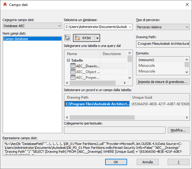 | Inserimento di un campo di database in una definizione di attributo | Vedere Come inserire campi in attributi AutoCAD. |