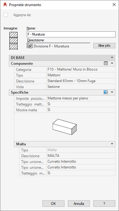 L'aspetto del foglio di lavoro Proprietà strumento varia a seconda del tipo di componente e della configurazione corrente delle impostazioni delle proprietà. Nelle figure seguenti vengono visualizzate due diverse configurazioni del foglio di lavoro Proprietà strumento relativo allo strumento 04 - Muratura incluso nella tavolozza degli strumenti campione Di base. In entrambi i casi lo strumento viene impostato per aggiungere un muro di mattoni standard da 3/8 di pollice, tuttavia nella prima configurazione la proprietà Vista è impostata su Sezione, mentre nella seconda è impostata su Prospetto (motivo). Nei componenti di dettaglio per i quali è possibile modificare l'orientamento in viste diverse, l'impostazione Vista determina la procedura di disegno specifica che verrà utilizzata per inserire l'immagine nel disegno. Notare che le diverse impostazioni Vista determinano immagini con orientamento diverso nel foglio di lavoro. Notare inoltre che le specifiche relative alla malta non sono applicabili in vista Prospetto (motivo) e non vengono pertanto visualizzate nella relativa configurazione. Le proprietà visualizzate nella sezione Specifiche possono inoltre variare a seconda di altre impostazioni. Ad esempio, se la proprietà Mostra malta è impostata su No quando l'impostazione di vista è Sezione, non verrà visualizzata nessun'altra proprietà attinente alla malta. Per alcuni componenti di dettaglio non viene applicata alcuna specifica, pertanto tale intestazione non viene visualizzata.