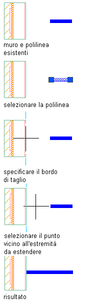 Per estendere una o più linee, polilinee aperte o archi fino al bordo implicito di un segmento retto o ad arco di un oggetto o fino ad un'estensione implicita dello stesso, attenersi alla procedura indicata di seguito.