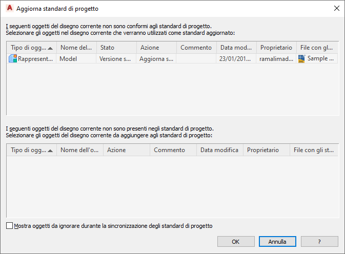 In questo caso, l'elemento non verrà più visualizzato nei successivi aggiornamenti, a meno che non si selezioni l'opzione Mostra oggetti da ignorare durante la sincronizzazione degli standard di progetto o non si rimuova il flag Ignora dall'impostazione di visualizzazione in Gestione visualizzazioni.