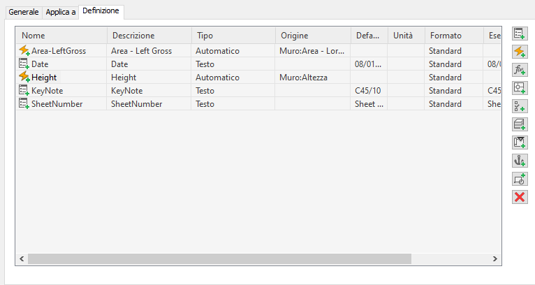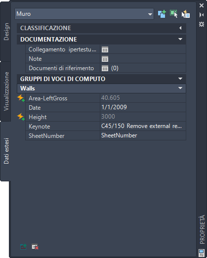 Proprietà di muro con campi per note chiave, data e numero di foglio