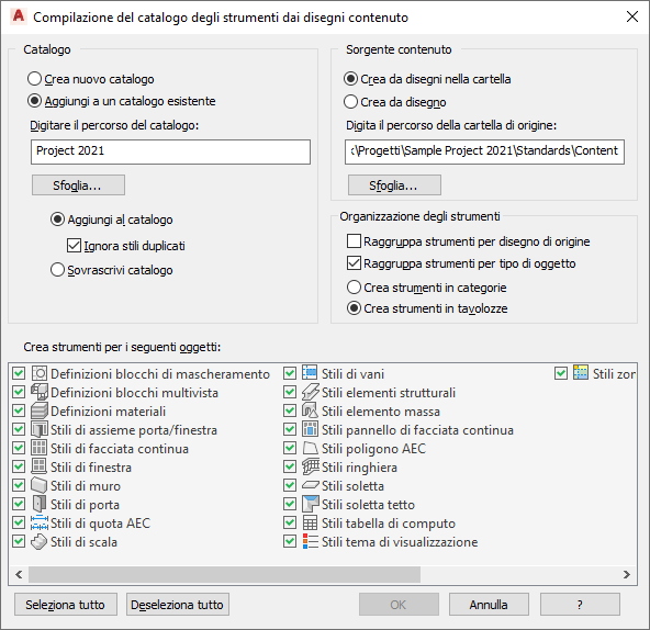 Questa opzione è consigliata quando si vogliono riunire in un nuovo catalogo gli stili di vari disegni. Gli strumenti risultanti verranno inclusi in categorie o tavolozze denominate "Muri", "Porte" e così via.