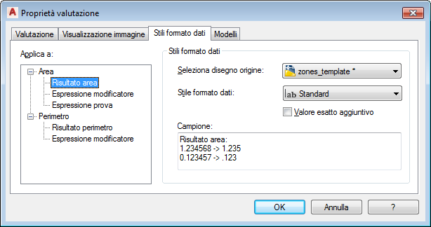 - Per Risultato area e Risultato perimetro, se si desidera che nel file di valutazione vengano inclusi i valori non arrotondati, selezionare la casella Valore esatto aggiuntivo.