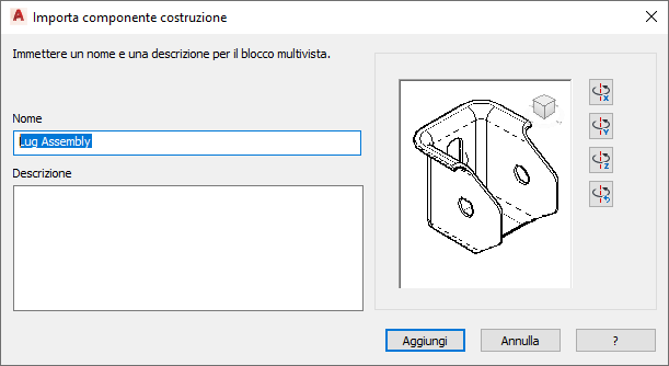 In tal modo, viene aperta la finestra di dialogo in cui è possibile specificare un nome e una descrizione e modificare l'orientamento del blocco o del blocco multivista durante l'inserimento.