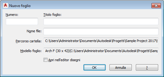 Immettere un numero. Se nelle impostazioni del progetto si è selezionato un prefisso per il progetto, questo verrà anteposto al numero di foglio nel nome del file. |