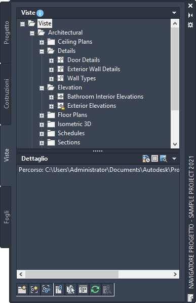 Nella scheda Viste del Navigatore progetto si creano singole viste dei dati di costruzione. Le viste contengono costruzioni e rappresentano la posizione principale per l'aggiunta di annotazioni come note, indicatori e quote all'interno del progetto. Una volta creato un disegno della vista, è possibile utilizzarlo per creare viste spazio modello.