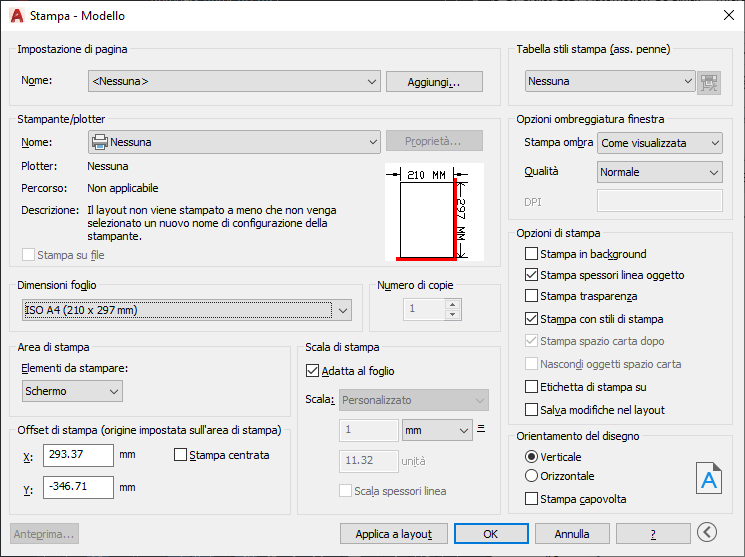 Specifica le opzioni per spessori di linea, trasparenza, stili di stampa, stampe ombreggiate e l'ordine di stampa degli oggetti.