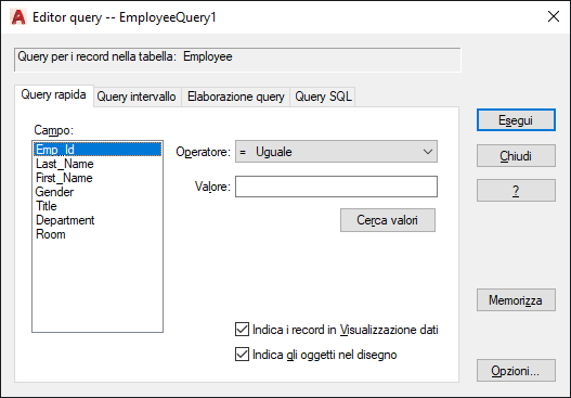 Apre la finestra di dialogo Opzioni di visualizzazione dati e di query.