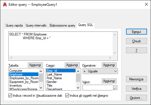 La scheda Query SQL contiene sia una casella di testo in cui è possibile digitare un'istruzione SQL in formato libero che un insieme di strumenti che semplificano la creazione della query. Poiché non tutti i sistemi di gestione database sono completamente compatibili con lo standard SQL 92, si consiglia di consultare la documentazione relativa al proprio sistema per conoscere quali comandi SQL possono essere utilizzati con il database.