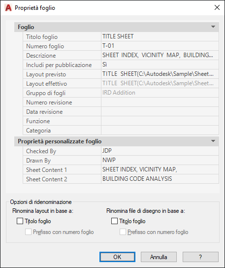 Visualizza le proprietà del foglio selezionato ed eventuali proprietà personalizzate. È possibile modificare le proprietà personalizzate immettendo un nuovo valore. Layout previsto indica il percorso e il nome file del disegno in cui è stato salvato il foglio. Layout effettivo indica il percorso e il nome file del disegno in cui è stato trovato il foglio. Se i percorsi sono differenti, è possibile modificare il percorso e il nome file in Layout previsto. Questa operazione riassocia il foglio al gruppo di fogli.