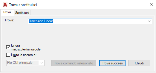 Individua una stringa di ricerca nei comandi o nelle proprietà dei comandi disponibili nei riquadri Elenco comandi o Personalizzazioni in <nome file>, o sostituisce una stringa di ricerca con una nuova stringa.