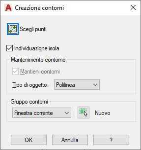 Definisce il tipo del nuovo oggetto contorno. CONTORNI crea il contorno come oggetto regione o polilinea.