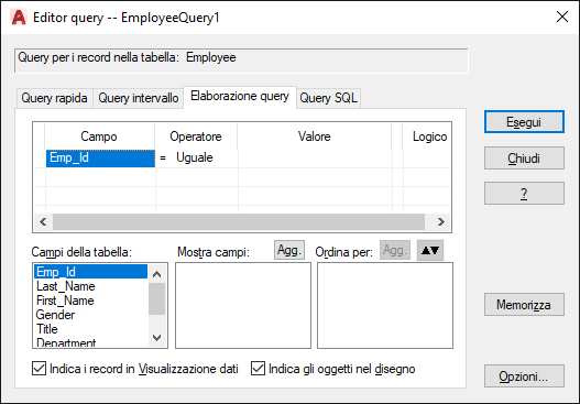 Consente di selezionare uno o più campi da includere nella query. Fare doppio clic sulla cella Campo della riga corrente per visualizzare l'elenco dei campi disponibili della tabella di database corrente che è possibile utilizzare per creare la query. Per aggiungere un altro parametro, specificare un operatore e un valore per la riga corrente, quindi selezionare la cella Logico.