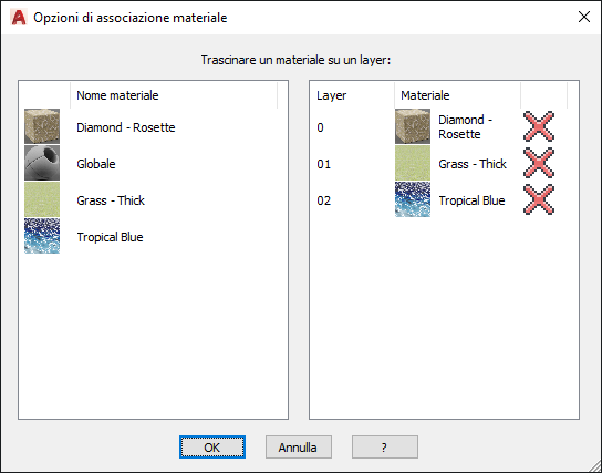 Elenca tutti i layer presenti nel disegno e in tutti i riferimenti esterni associati al disegno. L'anteprima del materiale mostra il materiale associato al layer. Utilizzare il pulsante Dissocia (la X) per rimuovere il materiale dal layer.