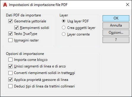 Imposta le opzioni per l'importazione di geometria, riempimenti, immagini raster e oggetti di testo TrueType da un file PDF specificato.