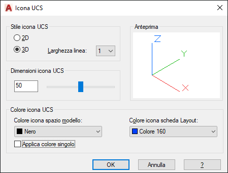 Specifica la visualizzazione dell'icona UCS 2D o 3D e il relativo aspetto.
