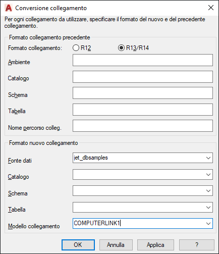 Specifica il formato del collegamento da convertire. I campi visualizzati variano in funzione dell'opzione (R12 o R13/R14) selezionata.