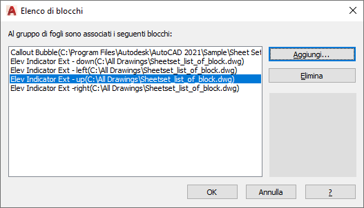 Per visualizzare questa finestra di dialogo, fare clic sul pulsante Aggiungi blocchi nella finestra di dialogo Categoria vista o sul pulsante [...] accanto a Blocchi vista dettaglio nella finestra di dialogo Proprietà gruppo di fogli.