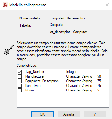 Visualizza tutti i campi disponibili per la tabella di database corrente, specificando anche il tipo e, nel caso dei campi per l'immissione di caratteri, la lunghezza del campo. Per specificare i campi chiave del modello di collegamento, selezionare la casella di controllo a sinistra del nome del campo dati.