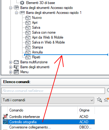 3. Nel riquadro Elenco comandi, trascinare il comando o il controllo da aggiungere alla barra degli strumenti Accesso rapido nel riquadro Personalizzazioni in <nome file>.