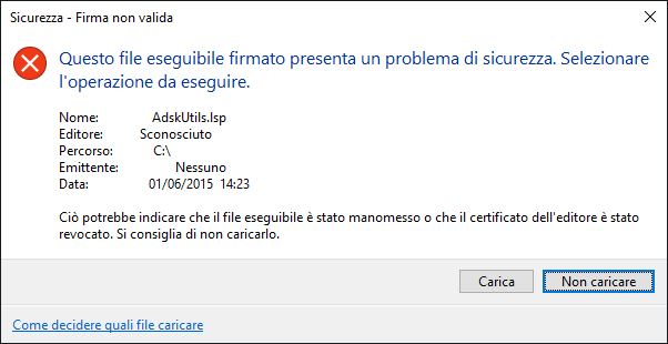 Durante il caricamento di un file di programma personalizzato con firma digitale, il programma basato su AutoCAD verifica la firma digitale allegata al file. Viene visualizzata una finestra di messaggio, se la firma digitale può essere verificata, che consente all'utente di caricare o meno il file di programma nell'ambiente di disegno.