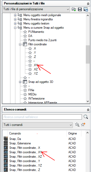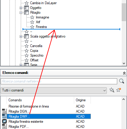 - Nella scheda Personalizza, nel riquadro Elenco comandi, individuare il comando da aggiungere e trascinarlo su un elemento dell'interfaccia utente nel riquadro Personalizzazioni in <nome file>.