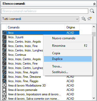 - Nel riquadro Elenco comandi della scheda Personalizza, individuare il comando da duplicare.