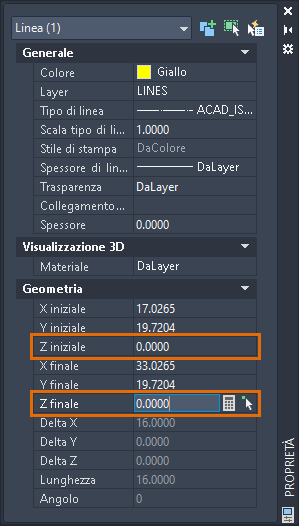 5. In questo esempio dell'oggetto linea, modificare i valori Z iniziale e Z finale in 0 (zero).