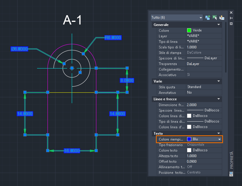 1. Con la tavolozza Proprietà aperta, fare clic su e selezionare tutti gli oggetti del disegno. Premere INVIO.