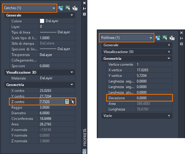 I nomi delle proprietà dell'asse Z saranno differenti per oggetti diversi. Un oggetto può avere una proprietà o una combinazione delle seguenti proprietà: Z iniziale, Z finale, Z posizione (testom), Z centrale (cerchi) o Elevazione (polilinee).