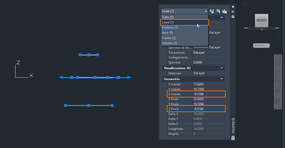 6. Selezionare un altro tipo di oggetto ed esaminare i valori delle coordinate dell'asse Z.