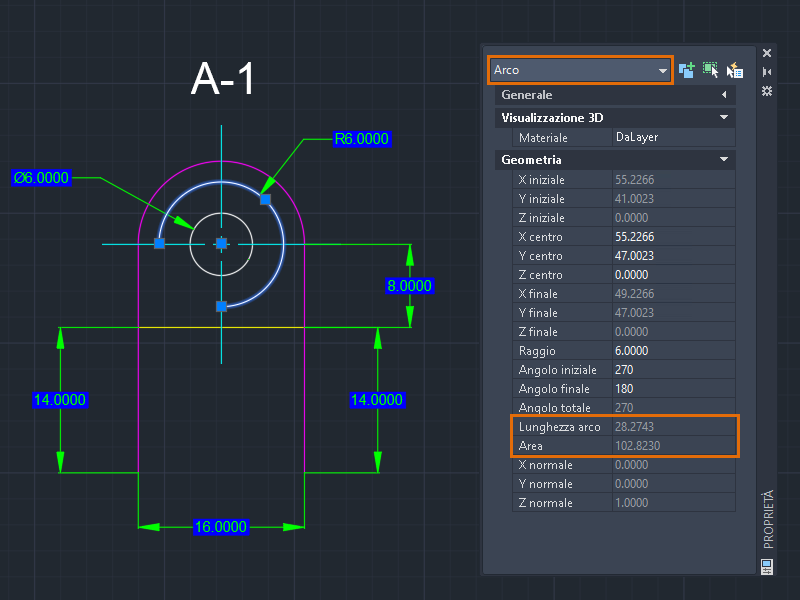 2. Esaminarne le proprietà. È possibile trovare facilmente l'area calcolata e la lunghezza dell'arco senza utilizzare alcun comando.