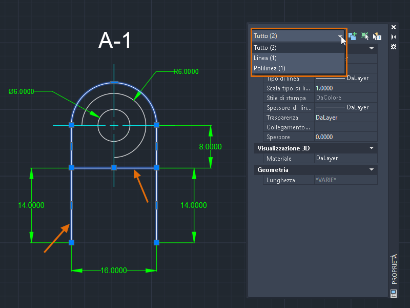 1. Selezionare oggetti di tipo diverso, ad esempio una linea e una polilinea.