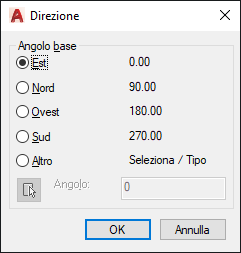 Imposta la direzione dell'angolo zero. Le opzioni che seguono hanno effetto sull'immissione degli angoli, sul formato di visualizzazione e sull'immissione delle coordinate polari, cilindriche e sferiche.